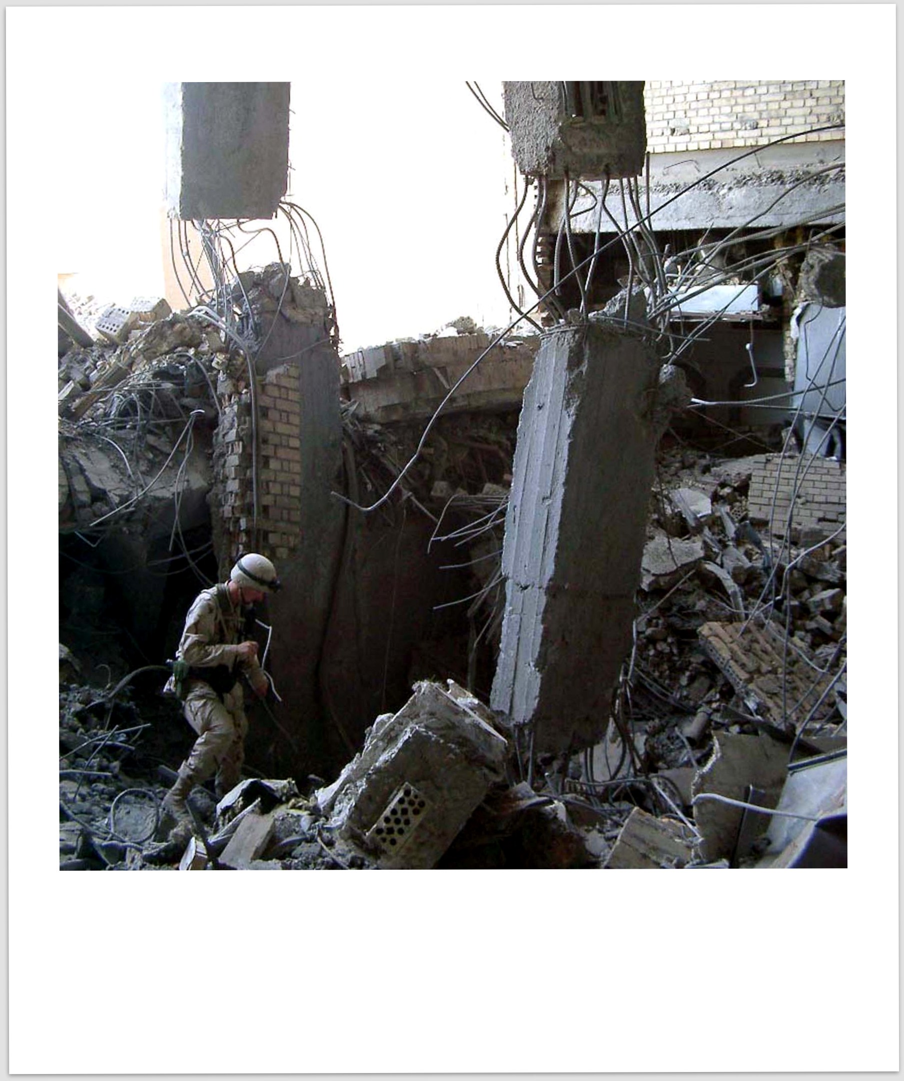 “Don’t worry, man,” you say, “We’ll get another one.” And so, the two of you clear all twelve floors left to right, right to left, ceiling to floor, floor to ceiling—looking not for enemy fighters, or hidden caches of weapons and evidence of the Saddam Hussein’s regime of tyranny, but because you are looking for garbage quality mementos like flags and unit insignia and bayonets that the Republican Guard has discarded to send home to your colleagues in suburban Connecticut.