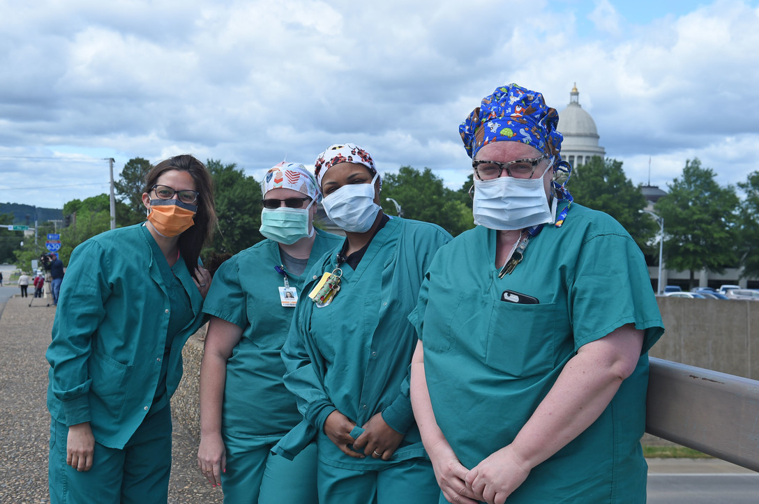 Healthcare workers watch U.S. Air Force C-130s from Little Rock Air Force Base fly over Arkansas, May 8, 2020.