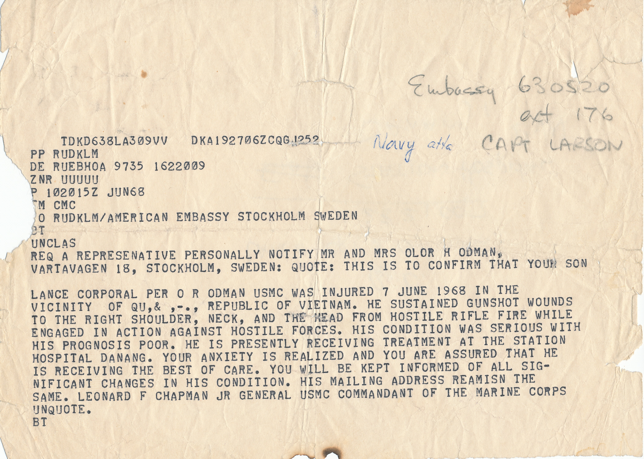 Letter updating family on Per-Olof Odman's injury