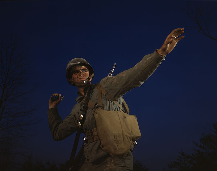 “An American pineapple, of the kind the Axis finds hard to digest, is ready to leave the hand of an infantryman in training at Fort Belvoir, Va, 1944. American soldiers make good grenade throwers.”